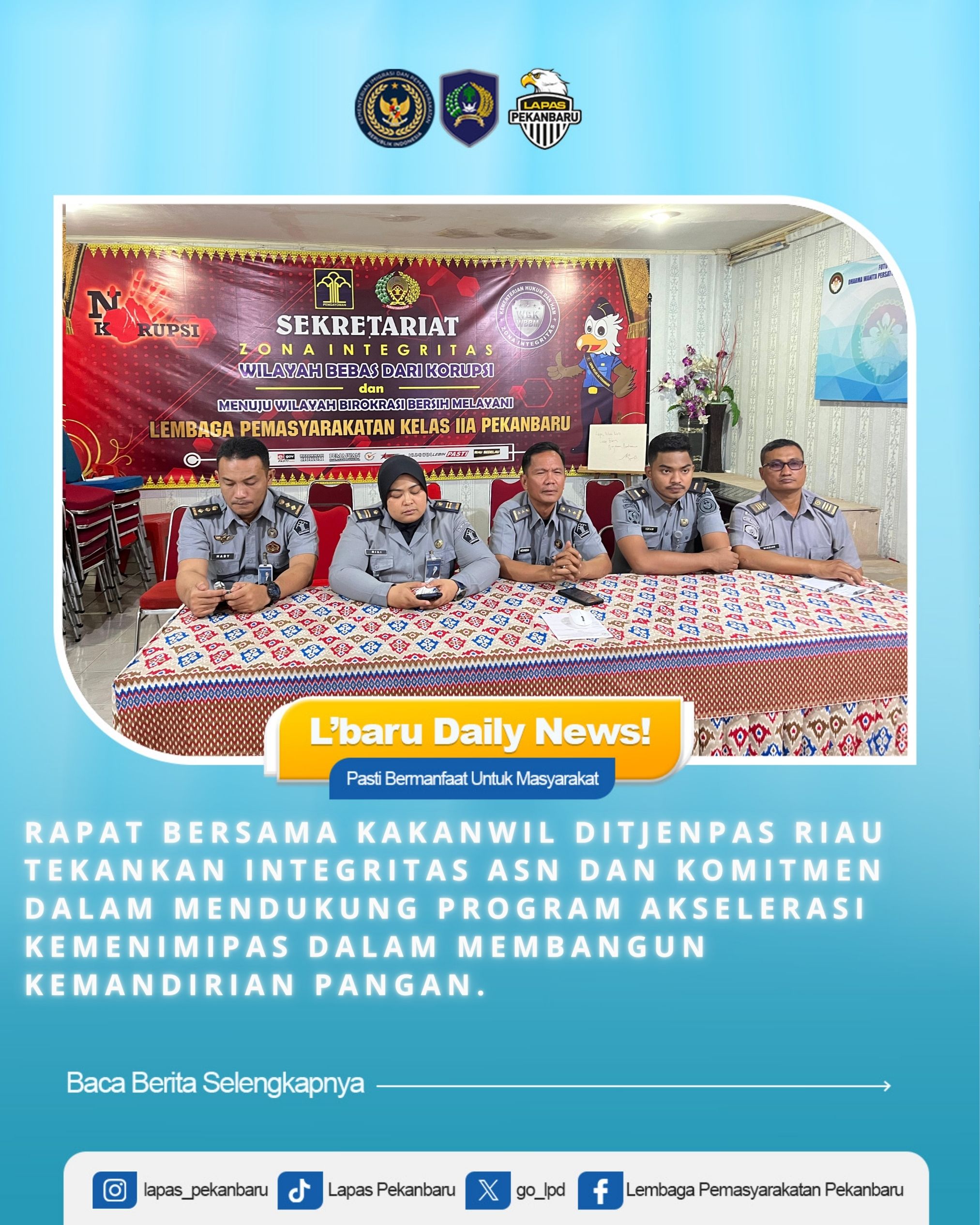 Rapat Bersama Kakanwil DitjenPas Riau Tekankan Integritas ASN dan Komitmen dalam Mendukung Program akselerasi Kemenimipas dalam membangun kemandirian pangan.