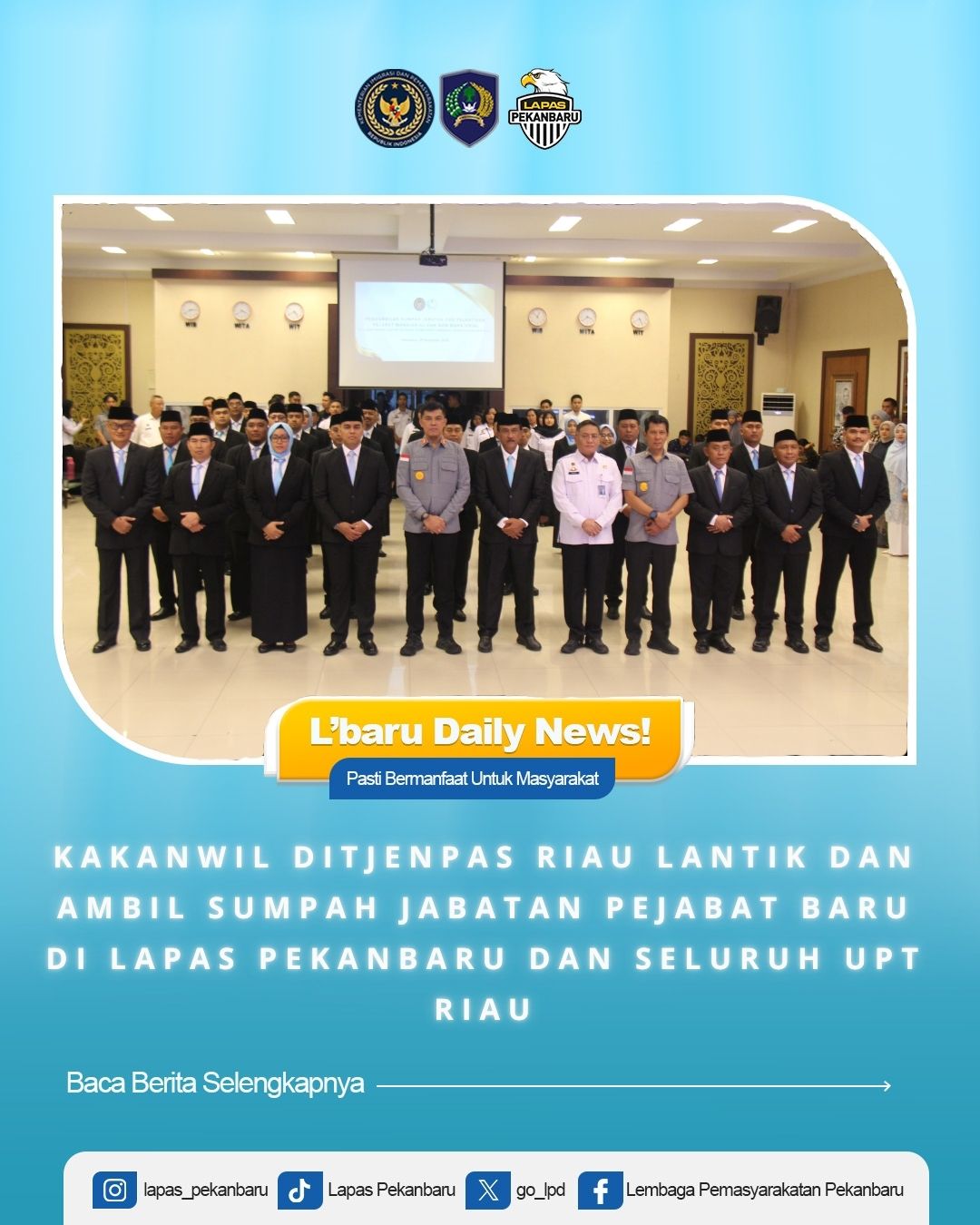 Kakanwil Ditjenpas Riau Lantik dan Ambil Sumpah Jabatan Pejabat Baru di Lapas Pekanbaru dan Seluruh UPT Riau