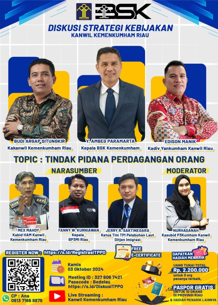 Kanwil KemenkumhamRiau mengajak Sobat semua untuk mengikuti Diskusi Strategi Kebijakan dengan topic Tindak Pidana Perdagangan Orang