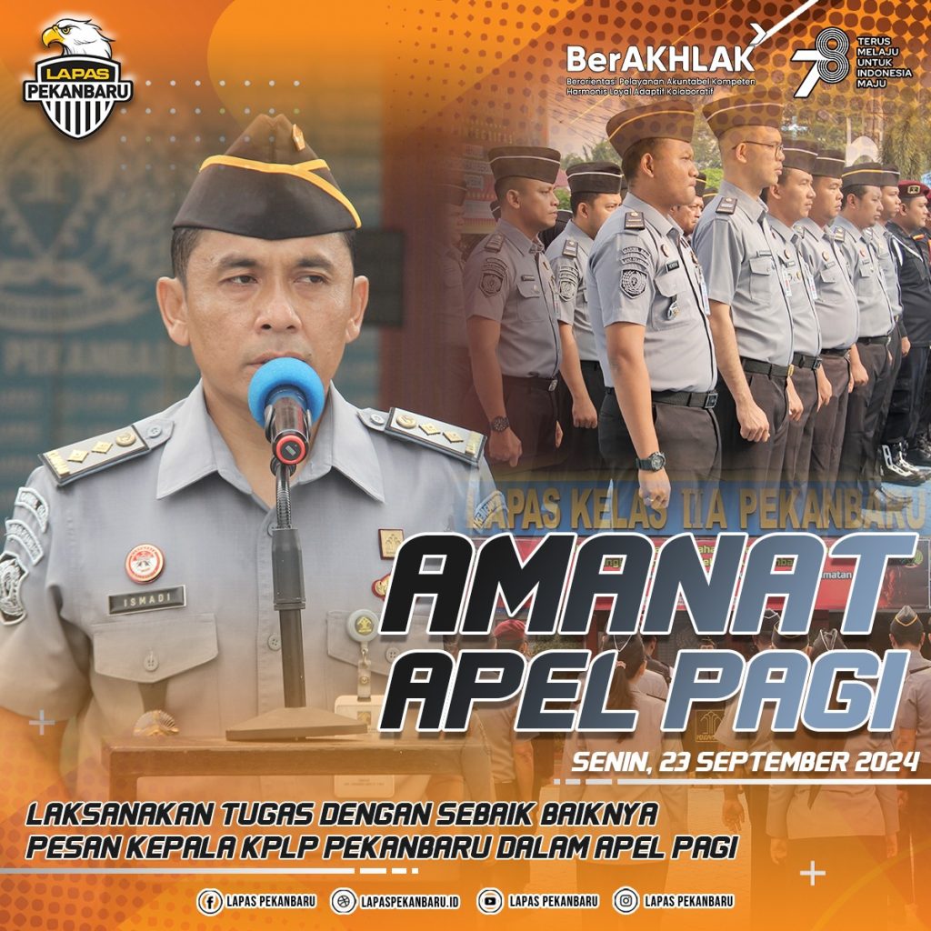 Pekanbaru, INFO_PAS – Apel pagi menjadi momentum penting bagi jajaran Lembaga Pemasyarakatan (Lapas) Kelas IIA Pekanbaru. Untuk itu, Lapas Kelas IIA Pekanbaru melaksanakan apel pagi rutin yang merupakan media bagi pimpinan untuk memberikan instruksi, apresiasi, motivasi hingga evaluasi tugas dan fungsi sebagai Petugas Pemasyarakatan dan wejangan diluar tugas dan fungsi sebagai Aparatur Sipil Negara (ASN).