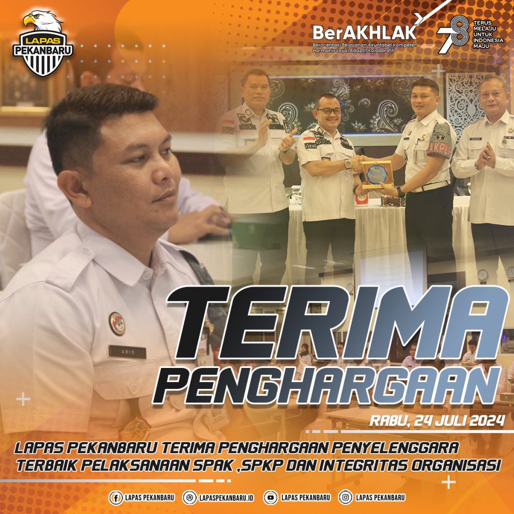 Dalam kegiatan rapat sekaligus laporan evaluasi, Lapas Kelas IIA Pekanbaru mendapatkan penghargaan sebagai penyelenggara terbaik pelaksanaan Survei Persepsi Anti Korupsi (SPAK) dan Survei Persepsi Kualitas Pelayanan (SPKP) serta Integritas Organisasi oleh Kantor Wilayah Kementerian Hukum dan HAM Riau.