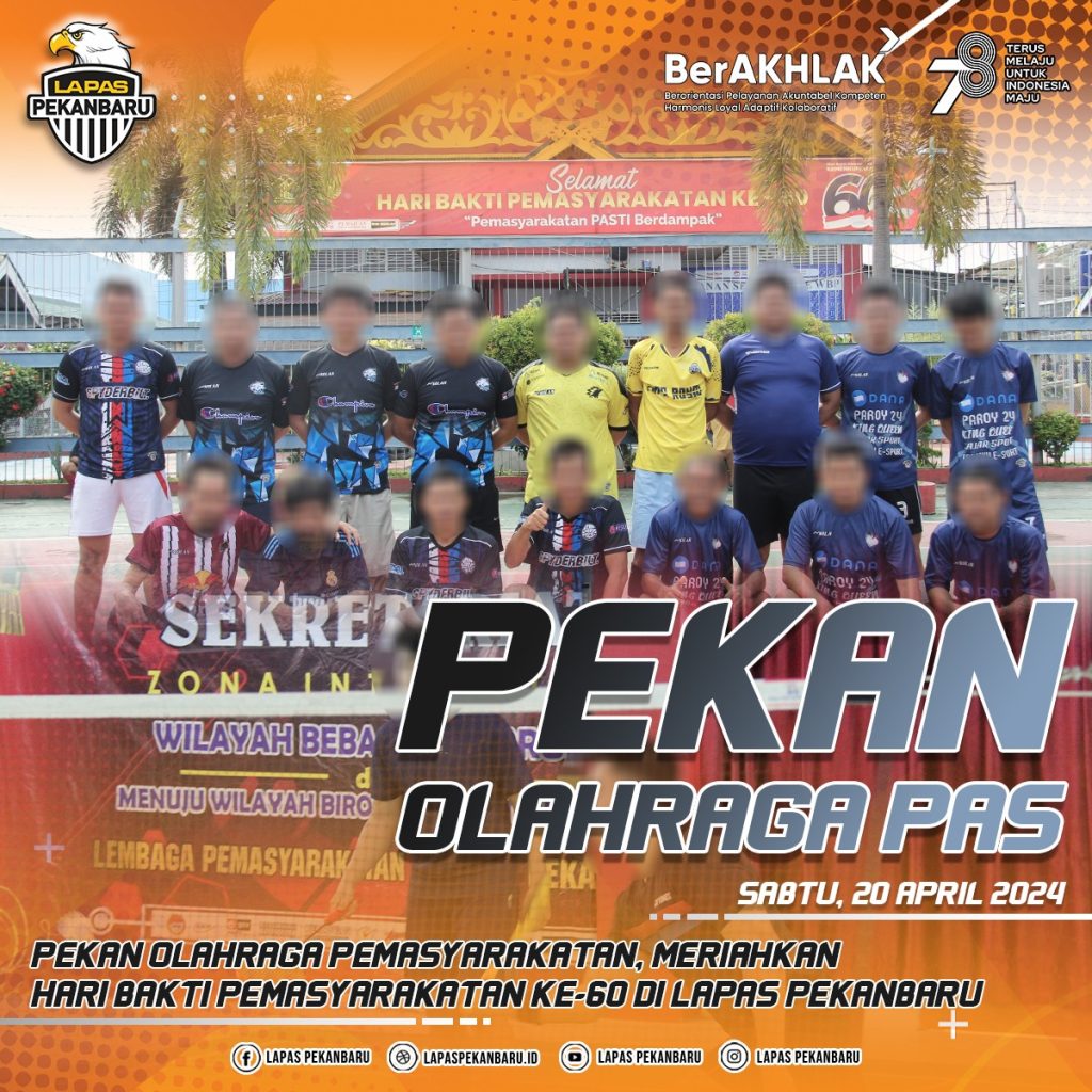 INFO_PAS|PEKANBARU| Lapas Kelas IIA Pekanbaru menggelar Pekan Olahraga Pemasyarakatan dalam rangka peringatan Hari Bakti Pemasyarakatan ke-60. Acara yang dimulai dengan semangat tinggi ini menjadi momen penting bagi warga binaan pemasyarakatan dan petugas lapas dalam memperingati tonggak bersejarah ini, Sabtu(20/04/2024).
