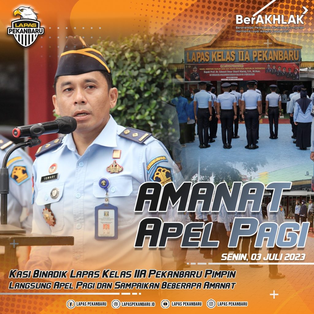 INFO_PAS|PEKANBARU|Dibawah terik sinar matahari pagi ini, tak menyurutkan semangat para pegawai Lembaga Pemasyarakatan (Lapas) Kelas IIA Pekanbaru untuk melaksanakan apel. Apel pagi rutin merupakan media bagi pimpinan untuk memberikan instruksi, evaluasi tugas dan fungsi sebagai Petugas Pemasyarakatan hingga wejangan diluar tugas dan fungsi sebagai Aparatur Sipil Negara (ASN), Senin (03/07/2023).