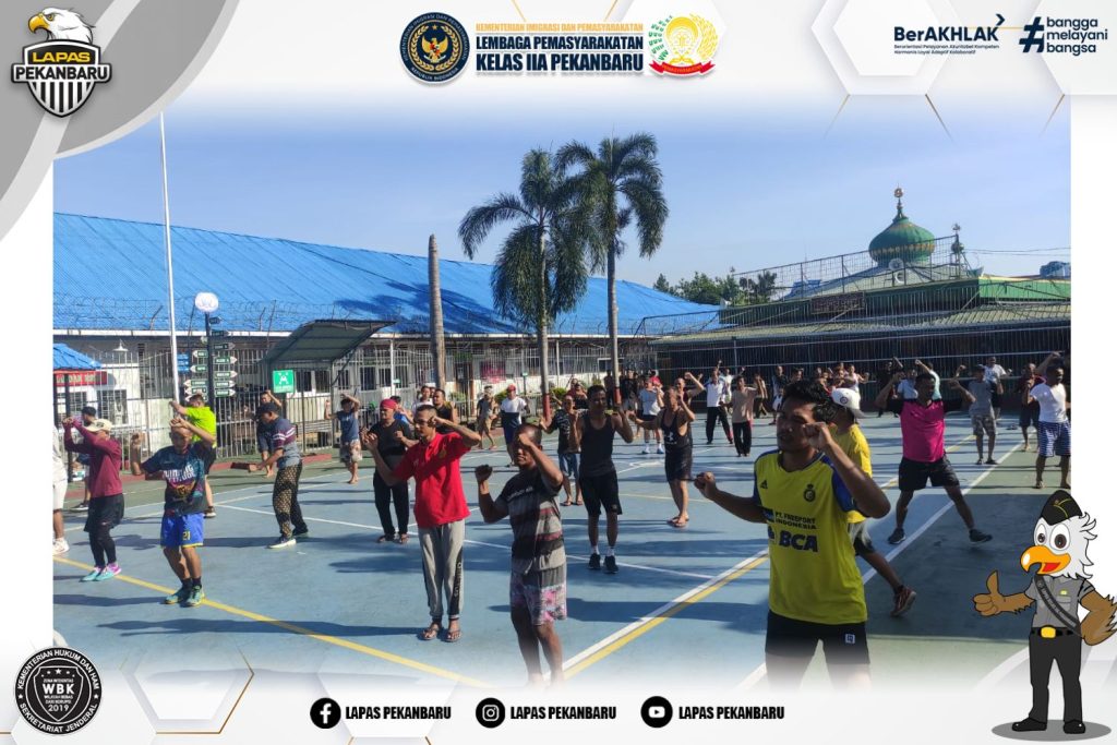 Pekanbaru, INFO_PAS – Olahraga merupakan suatu kegiatan yang dapat meningkatkan kesehatan tubuh manusia. Oleh sebab itu warga binaan Lembaga Pemasyarakatan (Lapas) Kelas IIA Pekanbaru mengikuti kegiatan olah raga senam diadakan di Lapangan Olahraga Lapas Pekanbaru mulai pukul 08.00 WIB sampai dengan selesai, Sabtu (10/05).