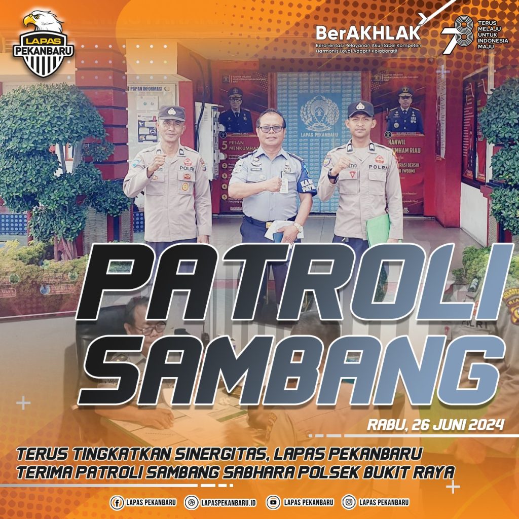 Dalam rangka peningkatan keamanan di lingkungan Lembaga Pemasyarakatan (Lapas) dan Rumah Tahanan Negara (Rutan) maka dibutuhkan upaya-upaya preventif sebagai bagian dari manajemen untuk meminimalisir resiko dalam sebuah organisasi. Untuk mewujudkan hal tersebut Lapas Kelas IIA Pekanbaru bekerja sama dengan Satuan Sabhara Polsek Bukit Raya melalui kegiatan patroli sambang, Selasa (25/06/2024).